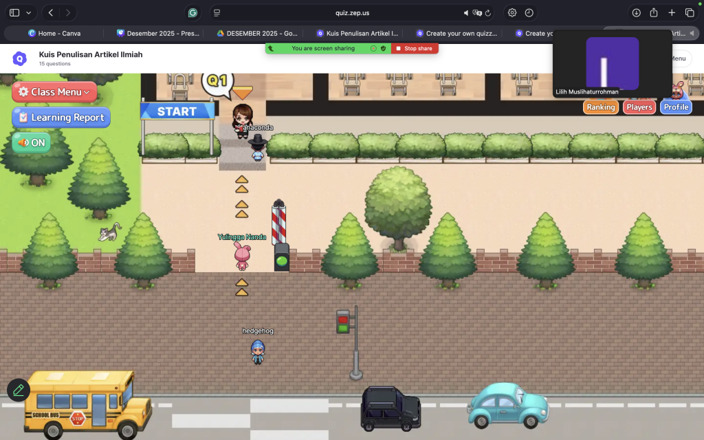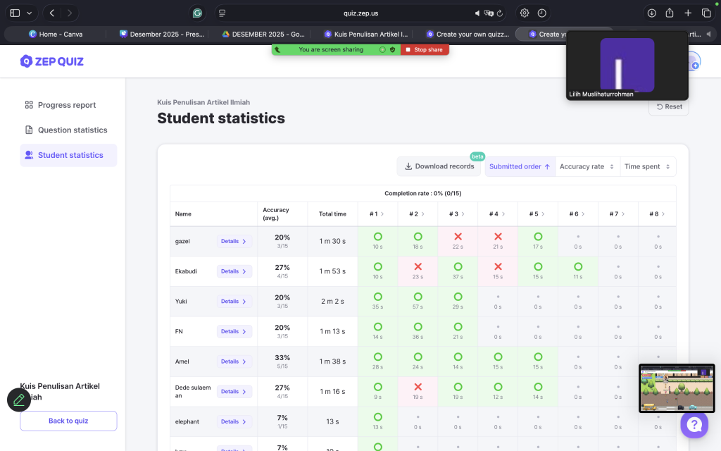 Sebelum sesi pemaparan materi, peserta terlebih dahulu mengikuti kuis interaktif melalui Zep Quiz. Kuis ini berisi pertanyaan seputar penulisan artikel ilmiah dengan desain menyerupai game edukatif, sehingga membuat suasana lebih energik dan kompetitif. Aktivitas pembuka ini berhasil meningkatkan antusiasme peserta sekaligus mengukur pemahaman awal mereka.