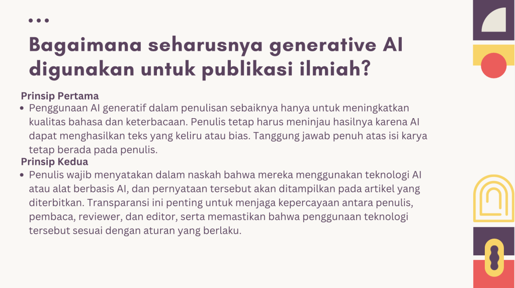 Sebagai isu yang semakin relevan, pemateri menekankan pentingnya menggunakan teknologi AI secara etis. AI boleh digunakan sebagai alat bantu, namun tetap harus mengutamakan orisinalitas, integritas ilmiah, serta menghindari plagiarisme maupun ketergantungan berlebihan.